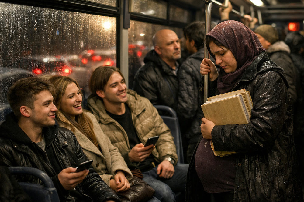 Otobüste bulunan diğer yolcular bu sözlerden rahatsız oldu, hafif homurdanmalar duyuldu. Ama kimse bu saygısız gençlerle tartışmaya girmek istemedi. Selma’nın yüzü utançtan kızardı, gözleri doldu. Sessizce başını öne eğip biraz geri çekildi. Gençler ise bunu kendi zaferleri gibi görüp birbirlerine gururla baktılar.